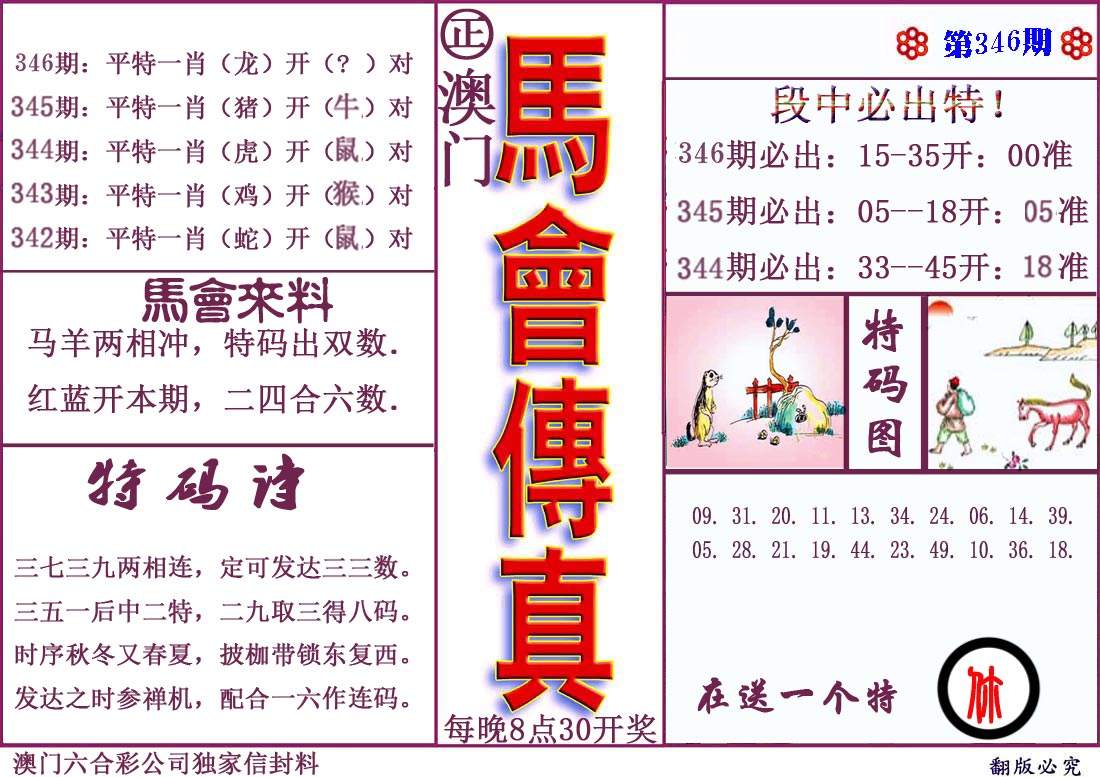 346期会传真:〖开?00〗 马羊两相冲,特码出双数.红蓝开本期,二四合六数。 解析:诗句解马羊兔牛 综合特肖:马羊兔牛鼠鸡狗蛇 综合六肖:虎猪羊狗蛇鼠 主推特码:24 48 23 35 03 05 30 45 20 25 |